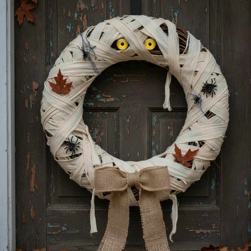 Transform a basic wreath into an ancient Egyptian nightmare with mummy wrap techniques that look professionally preserved. Start with any wreath shape and wrap entirely in white gauze or cheesecloth, leaving some strips hanging loose for weathered effects. Tea-stain some fabric sections for aged authenticity suggesting centuries of tomb dwelling. Create an opening in the wrapping where large googly eyes peer out mysteriously. Add plastic spiders and rubber beetles crawling through the wrappings for tomb-invasion realism. Attach hieroglyphic tags warning of mummy's curses in gold paint on aged paper. Spray selective areas with glow-in-the-dark spray for ethereal nighttime effects. Include hidden speakers playing soft moaning sounds activated by doorbell rings. This interactive wreath combines visual scares with audio elements, creating multi-sensory Halloween experiences that engage visitors beyond simple decoration viewing.