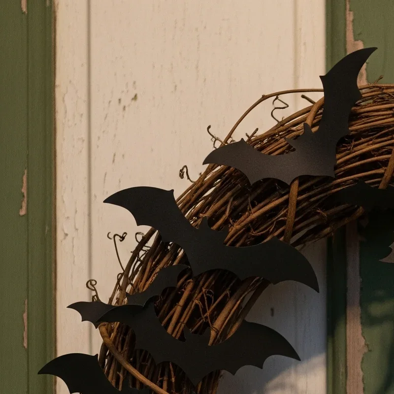 Create the illusion of disturbing a sleeping bat colony with a wreath featuring dozens of bats in various flight positions. Cut bat silhouettes from black cardstock or felt in multiple sizes, from tiny babies to impressive flying foxes. Fold wings at different angles to suggest movement, with some bats appearing to launch while others settle. Layer bats densely in some areas while leaving others sparse, mimicking natural colony clustering behaviors. Add red rhinestone eyes to some bats for menacing glints in porch lighting. Incorporate grey and brown bats among the black for realistic variety suggesting different species. Extend some bats beyond the wreath boundary on thin wire, creating three-dimensional flight paths toward unsuspecting visitors. This nature-inspired horror design works perfectly with gothic or vampire themes while remaining sophisticated enough for upscale Halloween decorating.
