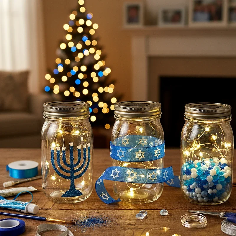 Transform mason jars into glowing luminaries that safely represent the miracle of light central to Hanukkah celebrations. Coat jars with blue and white tissue paper using decoupage medium, creating translucent surfaces that diffuse light beautifully. Add Star of David stickers or hand-drawn designs with permanent markers before inserting battery-operated tea lights or string lights. These luminaries provide ambient lighting for Hanukkah dinners without fire hazards, making them perfect for homes with young children. Line walkways or arrange them as centerpieces that guests can take home as meaningful party favors. Children learn about light's symbolic importance while creating practical decorations that illuminate their homes throughout the eight nights. Store carefully for reuse, adding new decorations each year to mark your family's growing Hanukkah tradition collection.