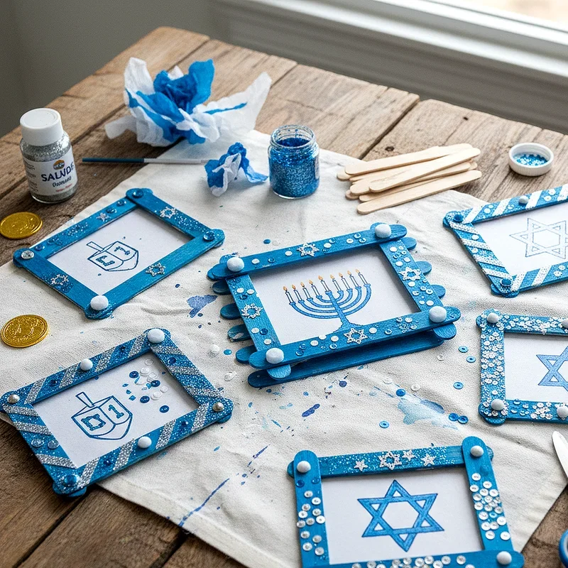 Create festive frames that showcase favorite Hanukkah memories using simple popsicle sticks and creativity. Arrange sticks in Star of David patterns or menorah shapes, securing them with strong craft glue before painting in traditional blue and white colors. Add sparkly embellishments like sequins, small buttons, or miniature dreidel charms to make each frame unique and special. These frames perfectly display photos from Hanukkah celebrations, family gatherings, or children lighting the menorah for the first time. Kids learn about construction and design while developing patience as they wait for glue to dry between steps. Write the year on the back so families can track their Hanukkah celebrations through the years as collections grow. Grandparents love receiving these personalized frames filled with current photos of their grandchildren celebrating the holiday.