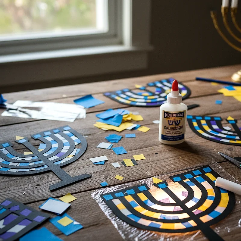 Design luminous menorah artwork that glows when placed against windows using black construction paper and colorful tissue paper. Cut a menorah silhouette from black paper, creating the outline of candles and flames with careful precision. Back with clear contact paper and fill spaces with overlapping tissue paper pieces in blues, purples, and yellows for stunning effects. This project teaches color mixing as children discover how layering different tissue papers creates new shades and depths. Hang finished pieces where sunlight transforms them into glowing celebrations of light that change throughout the day. Families can make one for each night, adding a new "lit" candle daily to mirror the actual menorah lighting. These lightweight decorations travel easily to grandparents' homes or classroom celebrations, spreading Hanukkah joy wherever they're displayed.