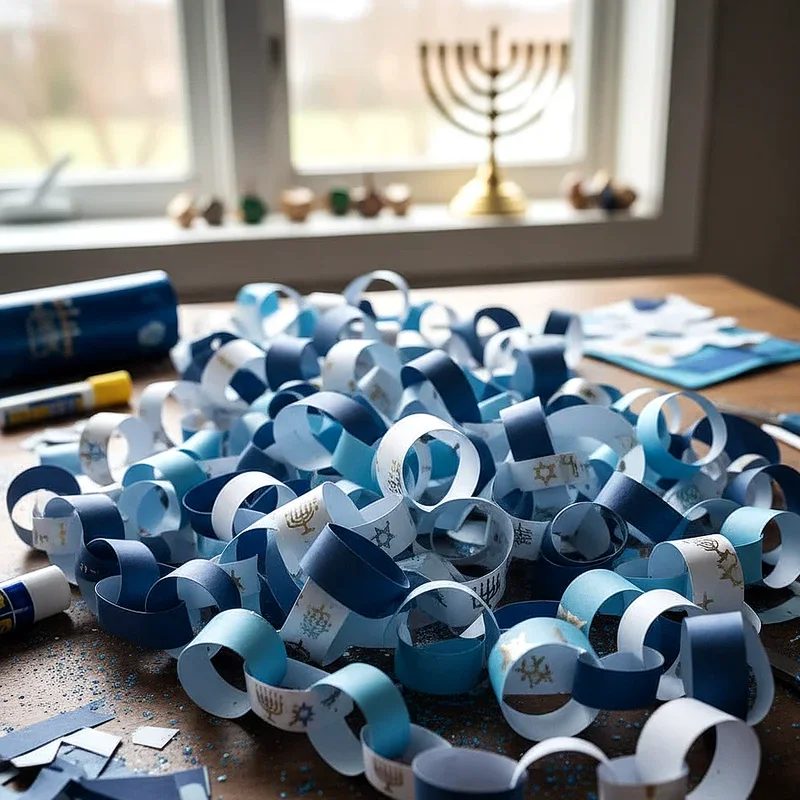 Link together rings of blue and white paper to create garlands that represent unity and continuity in Jewish tradition. Cut strips of construction paper or use patterned scrapbook paper featuring Stars of David, menorahs, or Hebrew text for added visual interest. Children practice counting by making chains with eight links for each night or creating patterns that repeat meaningful number sequences. Drape these garlands across mantels, doorways, or windows to instantly transform any space into a Hanukkah wonderland. Add silver or gold rings periodically for extra sparkle that catches light from menorah candles or overhead fixtures. Making chains becomes a meditative family activity where conversation flows naturally while hands stay busy creating something beautiful together. Connect multiple chains to decorate entire rooms, with each family member contributing their own section to the communal decoration.
