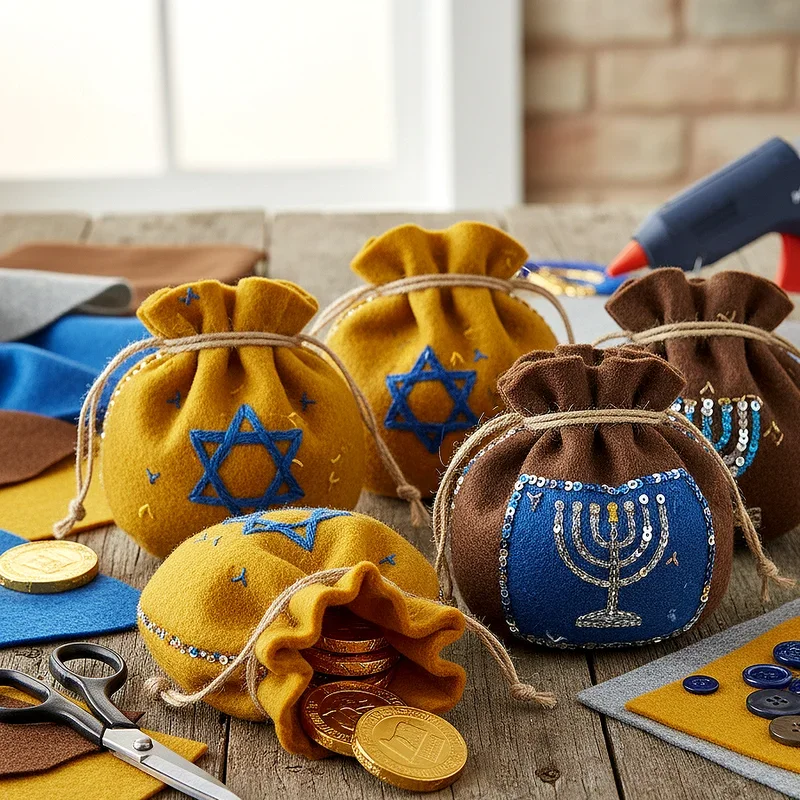Sew or glue simple felt pouches designed to hold chocolate gelt or real coins for tzedakah during Hanukkah. Cut circles from gold or yellow felt, then show children how to blanket stitch around the edges, leaving an opening for a drawstring. Decorate pouches with fabric markers, adding Jewish stars, menorahs, or Hebrew letters that spell "gelt" or each family member's name. These pouches serve dual purposes as decorations and functional gift holders for Hanukkah presents. Younger children who can't sew can use fabric glue to attach decorative elements while learning about the tradition of giving gelt. Fill completed pouches with chocolate coins for a sweet surprise or use them to collect charity donations throughout the eight nights. They're perfect party favors that guests can take home and reuse every year.