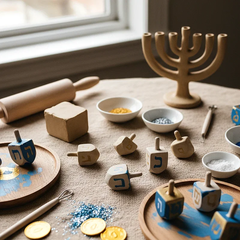 Shape air-dry clay or polymer clay into functional dreidels that actually spin while teaching children about this beloved Hanukkah game. Form four-sided tops with pointed bottoms and flat tops where you'll insert toothpicks or small dowels for spinning handles. Before the clay dries, carefully inscribe or stamp the Hebrew letters that make dreidel playing possible and meaningful. Paint dried dreidels in bright colors or leave them natural for a rustic appearance that emphasizes the handmade quality. Children learn about weight distribution and balance as they test their creations, adjusting shapes until they spin smoothly. Set up dreidel tournaments using your handmade game pieces, with chocolate coins or small prizes for winners. These personalized dreidels become cherished keepsakes that families bring out year after year, remembering the fun of making them together.