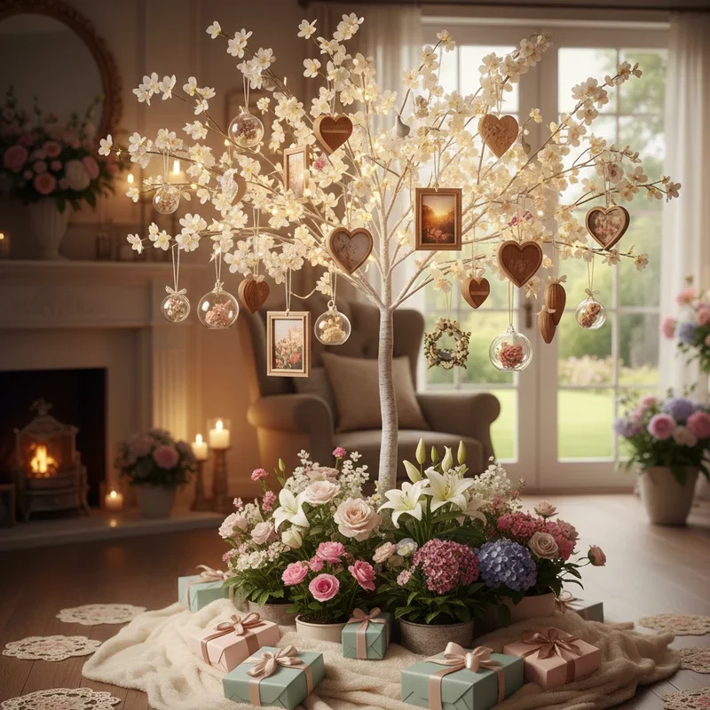 Create a unique focal point with a Mother's Day tree, similar to a Christmas tree but celebrating mom. Use a small artificial tree or large branches in a vase as your base. Hang photos, handwritten notes, and small gifts from the branches using ribbons. Add paper flowers, origami hearts, or miniature crafts made by grandchildren. String battery-operated lights for magical evening ambiance. Place wrapped gifts underneath like presents under a Christmas tree. Each family member contributes decorations representing their relationship with mom. This becomes an interactive decoration as mom discovers new additions throughout the day. The tree serves as a conversation piece and activity center during gatherings. After Mother's Day, mom can keep special ornaments as keepsakes. This tradition can grow yearly, with new additions marking each celebration. It's a creative way to combine decoration with gift-giving and memory-making.