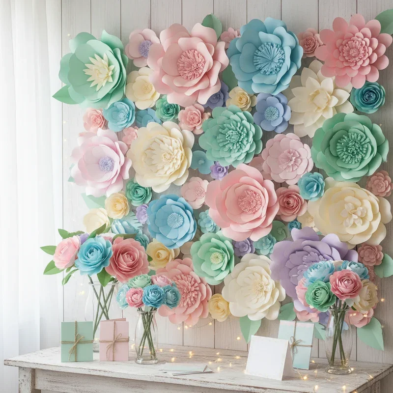 Why settle for temporary blooms when you can craft everlasting beauty? Create oversized paper flowers using tissue paper, crepe paper, or cardstock in mom's favorite colors. Mix different flower types like roses, dahlias, and poppies for variety. Build your backdrop on a large piece of foam board or directly on the wall using removable adhesive. Layer flowers at different depths for that three-dimensional wow factor. Add paper leaves and butterflies for whimsical touches. This backdrop serves multiple purposes: photo booth background, dining room focal point, or surprise reveal behind a doorway. The handmade element shows effort and love that store-bought decorations can't match. Kids can help create simpler flowers, making it a family bonding activity. YouTube tutorials make even complex flowers achievable for crafting newcomers. This decoration becomes a keepsake mom can display in her craft room or bedroom afterward.