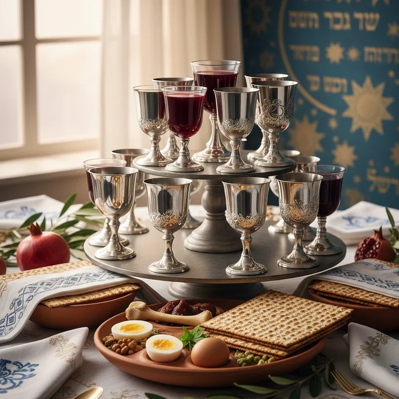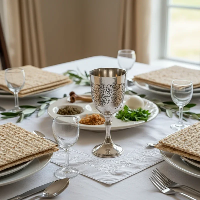 Design a magnificent display around Elijah's cup that transforms this tradition into a visual focal point worthy of the prophet's symbolic presence. Position an ornate goblet on a raised platform surrounded by battery-operated candles creating a mystical glow. Arrange smaller cups in a circle around Elijah's cup, representing each family member's connection to tradition. Include fresh grapes and vine leaves as decoration, symbolizing the wine and abundance associated with redemption. Add a beautiful cloth runner leading from the door to Elijah's cup, creating a visual pathway for his anticipated arrival. Write wishes for peace and freedom on small scrolls placed around the cup for guests to read. This enhanced presentation elevates a simple tradition into an installation that captures imagination and invites discussion about hope, faith, and the future we're building together.