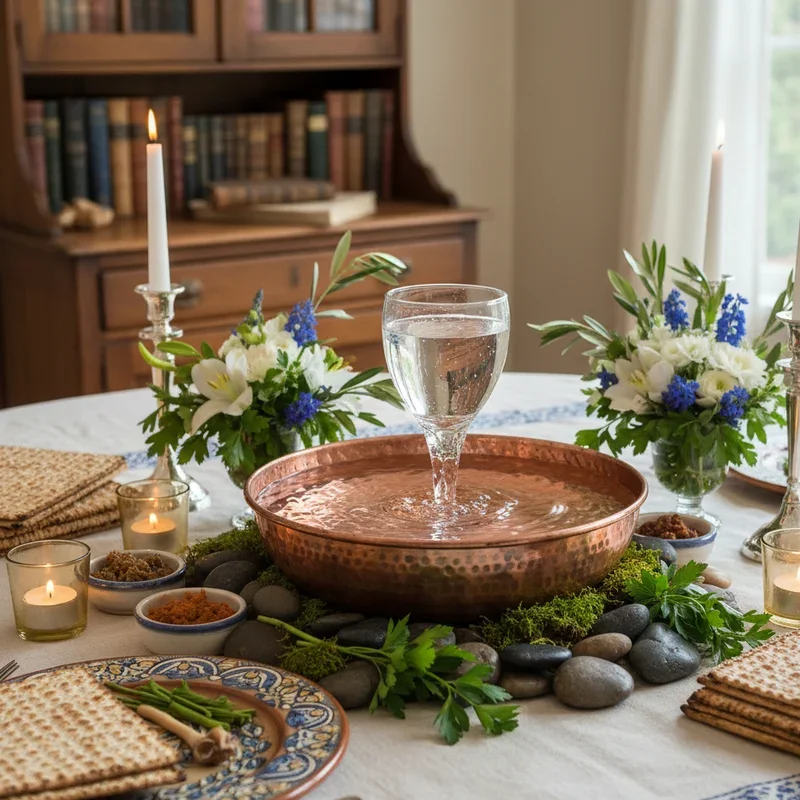 Design a beautiful water display centered around Miriam's Cup that honors the prophetess while adding movement and life to your decorations. Place a large, decorative cup or goblet in a shallow bowl surrounded by floating candles and flower petals. Create a small tabletop fountain incorporating Miriam's Cup as the water source, symbolizing her well's life-giving waters. Surround the display with blue and white stones, shells, or glass beads representing water and spiritual sustenance. Include small cards with quotes about Miriam's strength and leadership for guests to read and discuss. Add essential oils like lavender or rose to the water for subtle fragrance. This innovative display brings attention to women's roles in the exodus story while creating a peaceful, meditative focal point that balances the Seder table's abundance.