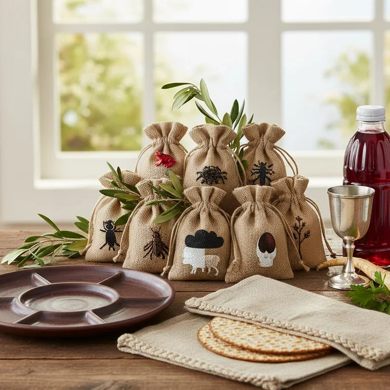 Create educational and entertaining plague bags that serve as both decoration and interactive teaching tools for the Seder. Design ten small bags using different fabrics or papers, each decorated with symbols representing one plague. Hang them as a garland across windows or walls, creating visual interest while maintaining their educational purpose. Fill bags with safe representations: plastic frogs, cotton balls for hail, sunglasses for darkness, and red ribbons for blood. Number each bag clearly and include brief descriptions in English and Hebrew for learning opportunities. Position bags at children's table settings as party favors they can explore during appropriate Seder moments. Use elevated materials like velvet or metallic fabrics to make even this playful element feel special and festive. These decorative teaching aids transform abstract biblical concepts into tangible, memorable experiences everyone can understand.