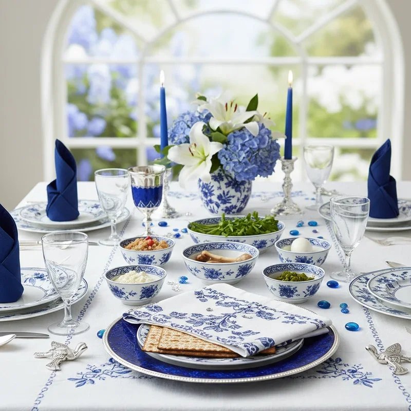 Embrace traditional Jewish colors with sophisticated blue and white table settings that create visual harmony while honoring cultural identity. Layer different shades from navy to powder blue through linens, creating depth without overwhelming the eye. Use white dishes as your canvas, adding blue accents through napkins, ribbons, and decorative elements. Incorporate silver accessories for metallic highlights that elevate the color scheme beyond basic. Mix patterns like stripes, florals, and geometric designs in your blue and white palette for visual interest. Add clear glass elements that reflect and amplify the color scheme while maintaining elegance. Position blue and white flowers in silver vases for natural color reinforcement. This cohesive color story creates a serene, sophisticated atmosphere that feels both festive and reverent, perfect for the Seder's blend of celebration and solemnity.