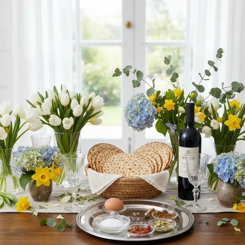 Celebrate Passover's connection to spring renewal with fresh flower arrangements that bring nature's rebirth into your home. Choose flowers in whites, purples, and yellows that echo traditional Passover colors while embracing seasonal blooms like tulips, daffodils, and hyacinths. Create tall arrangements for buffet tables and low centerpieces for dining tables that won't obstruct conversation across the Seder table. Include flowering branches like cherry blossoms or forsythia for dramatic height and symbolic representation of new growth. Float single blooms in individual glass bowls at each place setting for elegant personal touches. Incorporate herbs like rosemary and mint that connect to Seder plate elements while adding fragrance. These living decorations remind us that Passover coincides with spring's arrival, linking our celebration of freedom to nature's annual liberation from winter's grasp.