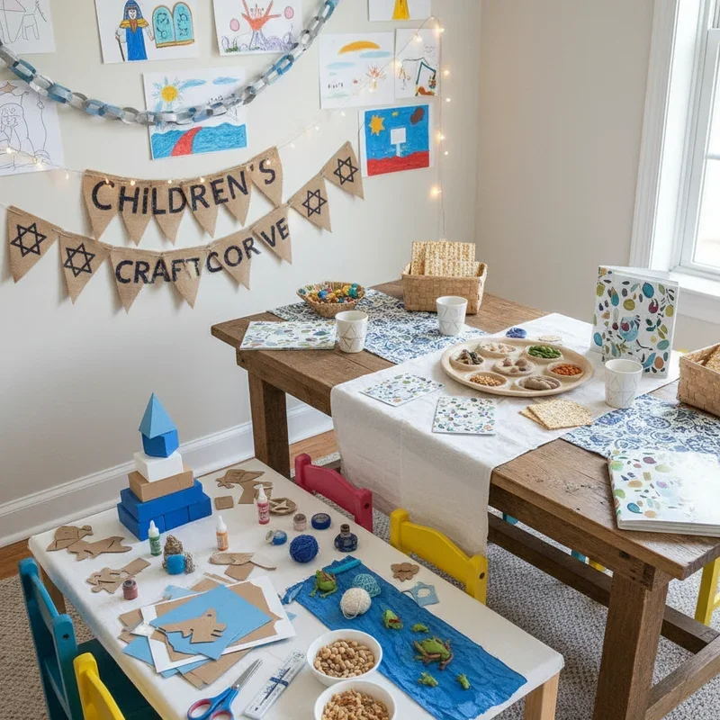 Designate a decorated space where children create Passover crafts that become part of your home's festive atmosphere. Set up a low table with Passover-themed coloring pages, stickers, and craft supplies in blue, white, and gold. Display completed artwork on a special "gallery" wall using colorful frames or clothespins on decorative string. Provide materials for making paper pyramids, Moses puppets, and decorated matzah covers children can use during the Seder. Include sensory elements like play dough for making Seder plate items or kinetic sand for "crossing the Red Sea" scenes. Organize supplies in decorated boxes labeled with Passover symbols, making cleanup part of the creative process. This dedicated space keeps children engaged while contributing to your home's decoration, making them feel like important participants in holiday preparations rather than passive observers.