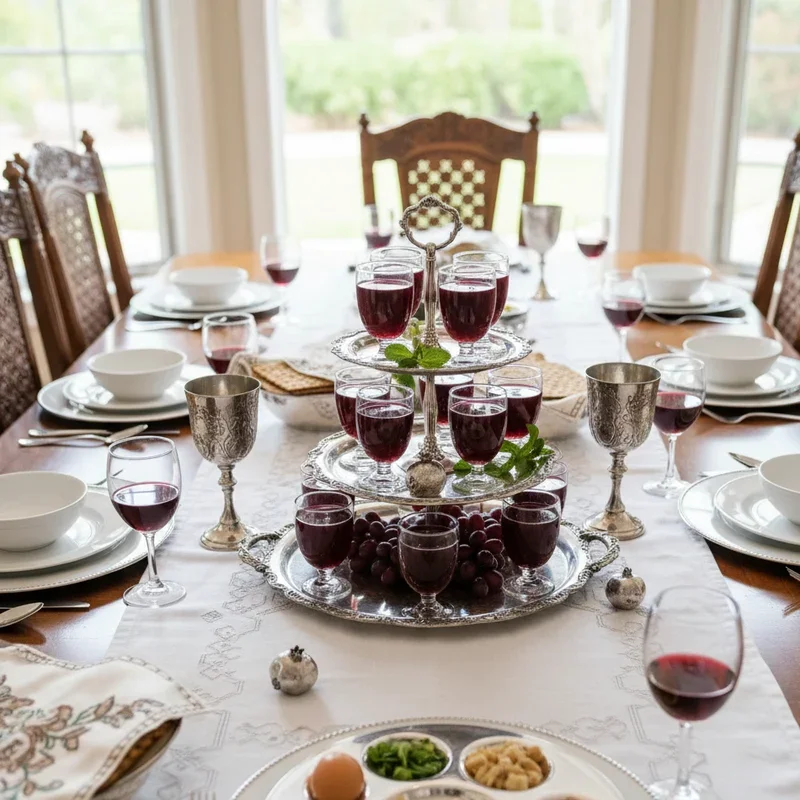 Showcase your Kiddush cups and wine glasses as decorative elements that honor the four cups of wine tradition. Arrange different styles of cups at each place setting, from ornate silver Kiddush cups to modern crystal stemware. Create a dedicated wine station with decanters and bottles displayed on a beautiful tray or side table. Use wine charms or ribbons to identify each person's cup throughout the evening's multiple wine blessings. Include non-alcoholic options like grape juice in equally beautiful vessels, ensuring all guests feel included regardless of age or preference. The variety of cups adds visual interest while accommodating different drinking preferences and traditions. Position Elijah's cup prominently but accessibly for the ceremonial opening of the door.