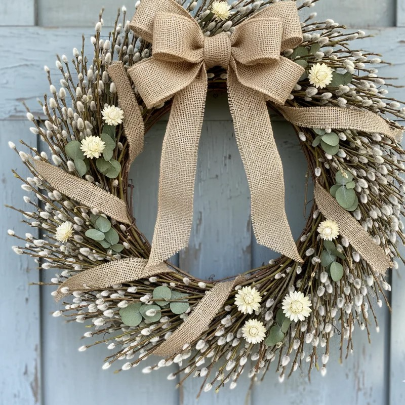 Embrace the raw beauty of early spring with this charming rustic creation that celebrates nature's subtle elegance. Pussy willows bring that distinctive fuzzy texture that screams early spring, while burlap adds warmth and countryside charm. Start with a wire wreath form and wrap it entirely in natural burlap, securing with hot glue or wire. Then, arrange pussy willow branches in a cascading pattern, varying the lengths for visual interest. You can enhance this design with small wooden eggs, twine bows, or even miniature bird nests. This wreath perfectly complements farmhouse-style homes, log cabins, or any entrance that celebrates rustic charm. The neutral color palette means it pairs beautifully with any front door color, making it incredibly versatile for your spring decorating needs.