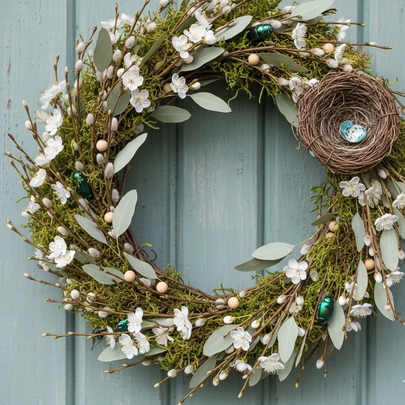 Celebrate new life and fresh beginnings with this charming wreath that incorporates natural bird's nest elements for authentic spring appeal. This design tells the story of spring's renewal through natural materials and thoughtful details that create narrative interest. Start with a natural grapevine base and incorporate real or artificial bird's nests, positioning them as focal points within the circular design. Add small decorative eggs in natural colors, spring flowers, and plenty of organic greenery. The key is making everything look naturally occurring, as if the nest happened to form within your wreath rather than being deliberately placed. Small artificial birds can add movement and life, but use them sparingly to avoid overwhelming the natural aesthetic. This wreath particularly appeals to nature lovers and works beautifully on homes surrounded by trees or natural settings where real birds might actually nest.
