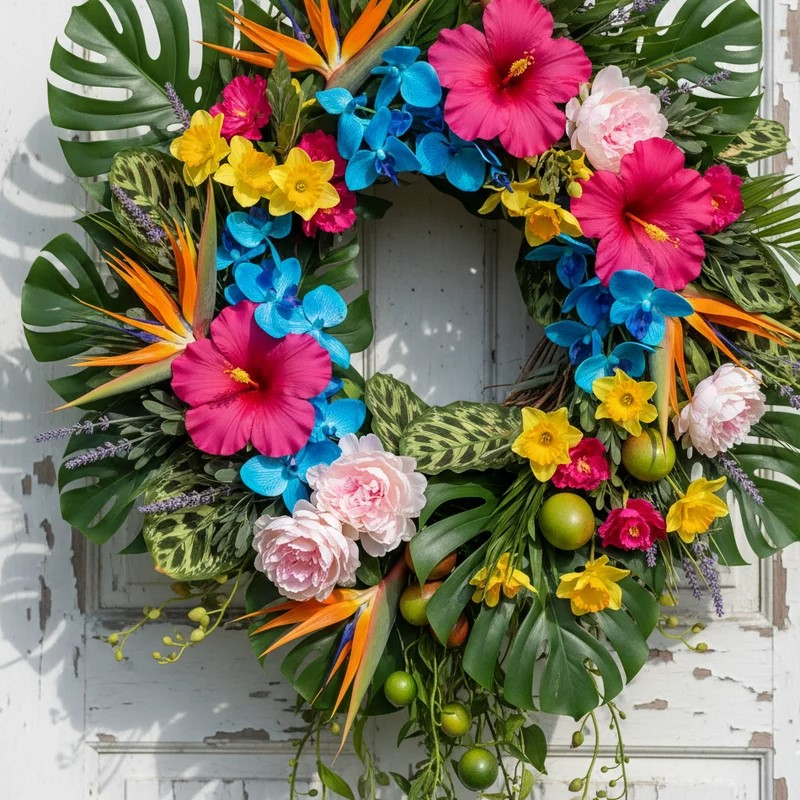 Who says spring has to mean pastels? This vibrant tropical-inspired wreath brings bold colors and exotic elements to spring decorating for those who love making dramatic statements. Combine bright spring flowers with tropical elements like palm fronds, vibrant birds of paradise, or bold hibiscus blooms. The color palette should be confident – think hot pinks, bright oranges, deep greens, and sunny yellows. This fusion approach works especially well in warmer climates where tropical elements feel natural, but it can also provide a striking contrast in cooler regions where neighbors expect traditional spring displays. The key is balance – ensure your tropical elements complement rather than compete with spring flowers. This wreath requires a confident decorating personality and works best on homes that already embrace bold design choices in their architecture or existing decor.