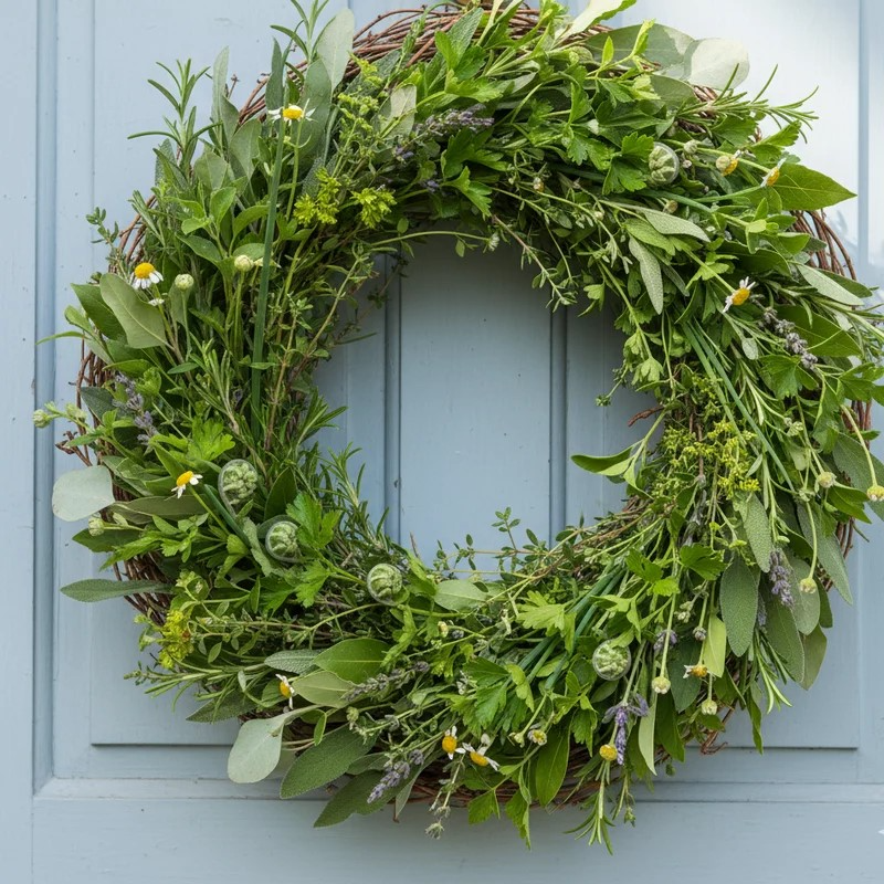 Why not create a wreath that's both beautiful and functional? This herb-focused design brings the aromatic garden to your front door while providing fresh ingredients for your kitchen. Start with a sturdy wire or foam base and attach bundles of fresh herbs like rosemary, thyme, sage, and lavender using floral wire. The natural greens and silvers create a sophisticated monochromatic palette that works with any home style. Add small pots of growing herbs directly to the wreath for an interactive element that guests will love. This living wreath requires more maintenance than artificial options, but the sensory experience is unmatched. The fragrances greet visitors before they even ring your doorbell, creating an memorable first impression. Replace herbs as needed throughout the season to maintain freshness and visual appeal.