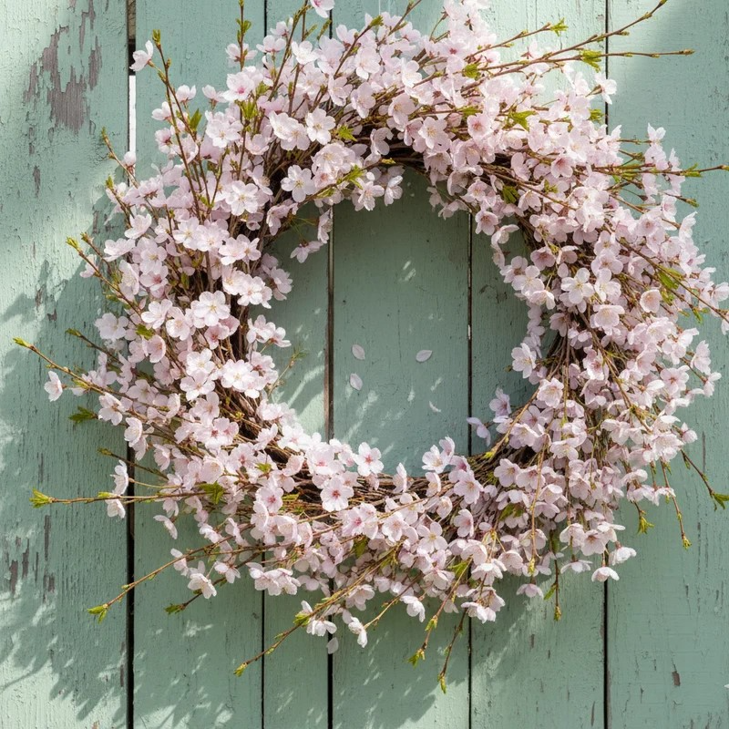 Capture the ethereal beauty of spring's most romantic blooms with this delicate cherry blossom wreath that brings Japanese garden elegance to your entrance. This design focuses on the soft, dreamy quality of cherry blossoms using high-quality silk branches in pale pink and white. Choose branches with realistic bark texture and varying bloom stages for authenticity. Arrange them on a natural wood or wire base, allowing some branches to extend beyond the circular form for organic movement. The key is restraint – less is definitely more with this sophisticated design. Add subtle touches like small birds or delicate ribbon in coordinating colors. This wreath works beautifully on doors with clean, modern lines or traditional architecture that appreciates understated elegance. The soft pink tones complement both light and dark door colors perfectly.
