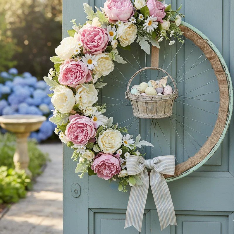 Transform a vintage bicycle wheel into a unique spring wreath that combines nostalgia with seasonal beauty for a truly one-of-a-kind front door display. This creative approach repurposes old bicycle wheels as the base for an eye-catching circular design that's sure to spark conversations. Clean and prepare your vintage wheel, then weave spring flowers, greenery, and ribbons through the spokes, creating a balanced arrangement that celebrates both the wheel's structure and spring's beauty. Choose flowers that complement the wheel's vintage character – perhaps soft pastels or muted tones rather than bright, modern colors. Add vintage-inspired elements like old keys, small watering cans, or weathered signs to enhance the nostalgic theme. This wreath works particularly well on cottages, farmhouses, or homes that already incorporate vintage or shabby chic elements in their decor.