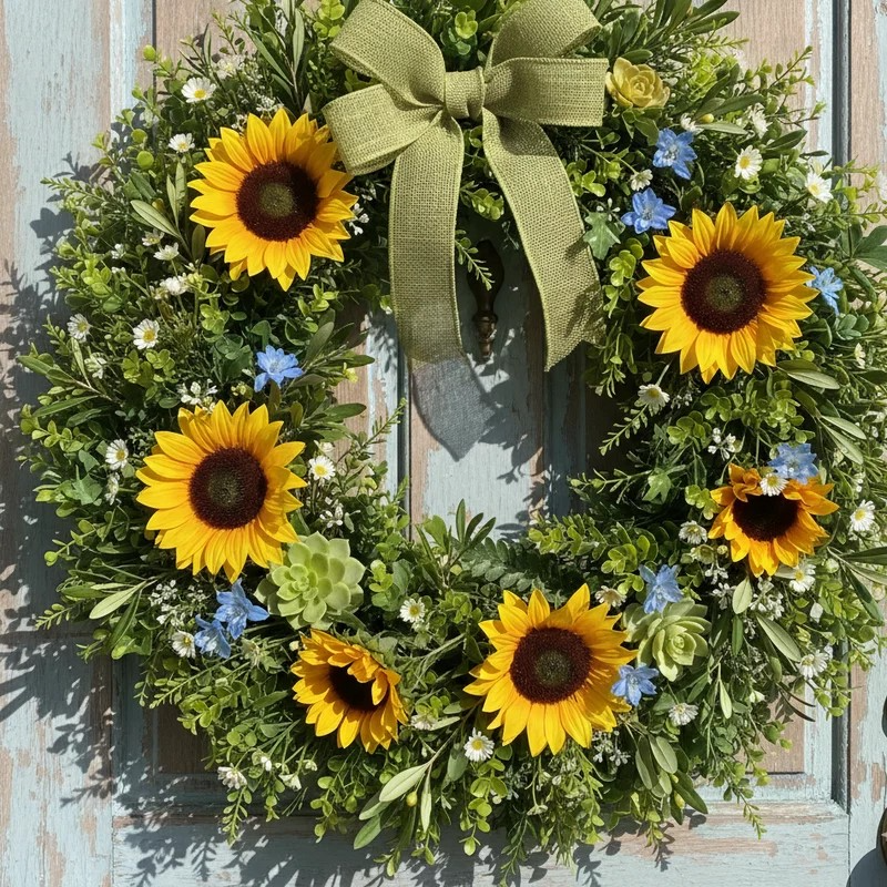 While sunflowers typically peak in late summer, smaller varieties and realistic artificial options make them perfect for spring wreaths that bridge the seasonal gap. This cheerful design combines the sunny disposition of sunflowers with fresh spring greenery for a display that's both happy and sophisticated. Use smaller sunflower varieties or scale-appropriate artificial ones, mixing them with eucalyptus, ferns, and other greenery in various textures. The yellow and green color combination feels fresh and natural while providing enough visual interest to keep the design engaging. This wreath works particularly well on white, blue, or natural wood doors where the colors can really shine. Add texture through different types of greenery – some smooth, some textured, some with interesting shapes. The result is a wreath that brings immediate smiles while maintaining enough sophistication for grown-up sensibilities.