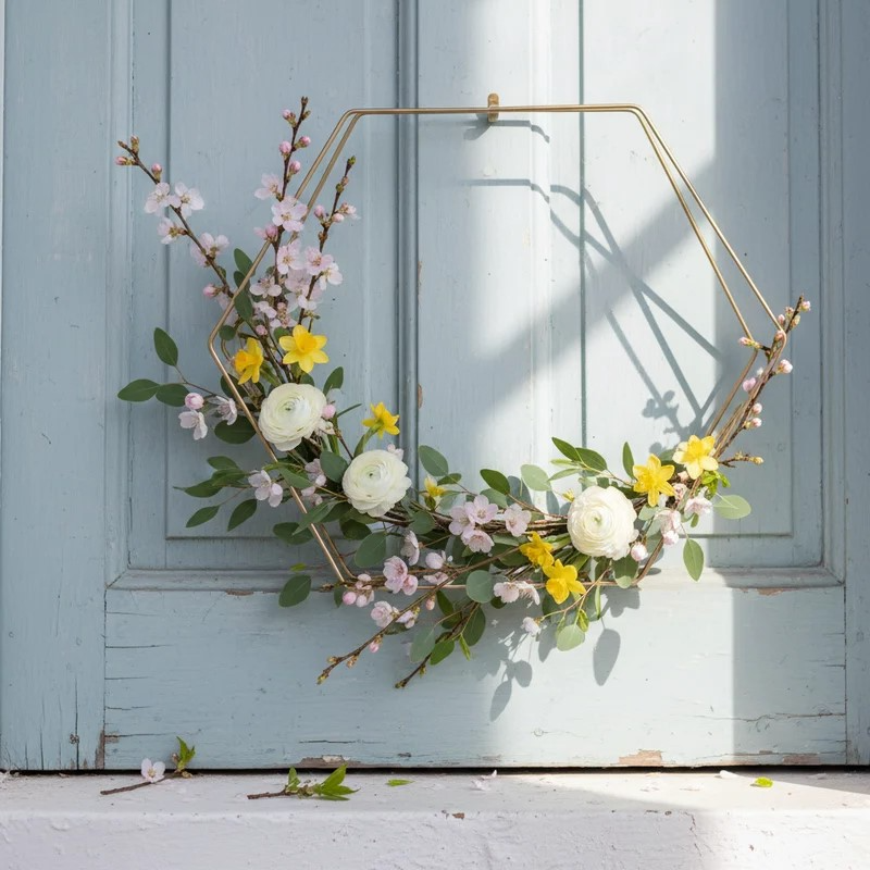 Who says spring wreaths have to be traditional? This contemporary design brings geometric shapes and modern sensibilities to seasonal decorating, perfect for homes with clean, architectural lines. Create this striking piece using a geometric base – perhaps hexagonal or square – made from metal or wood. Then, add spring elements within this structured framework, playing with the contrast between organic flowers and rigid geometry. Choose flowers with strong, defined shapes like tulips or calla lilies, and arrange them in patterns that complement your geometric base. The color palette should be carefully controlled – perhaps two or three colors maximum for maximum impact. This wreath appeals to homeowners who love contemporary design but still want to acknowledge the changing seasons. It's particularly stunning on modern homes with minimalist architecture or bold, contemporary front doors.