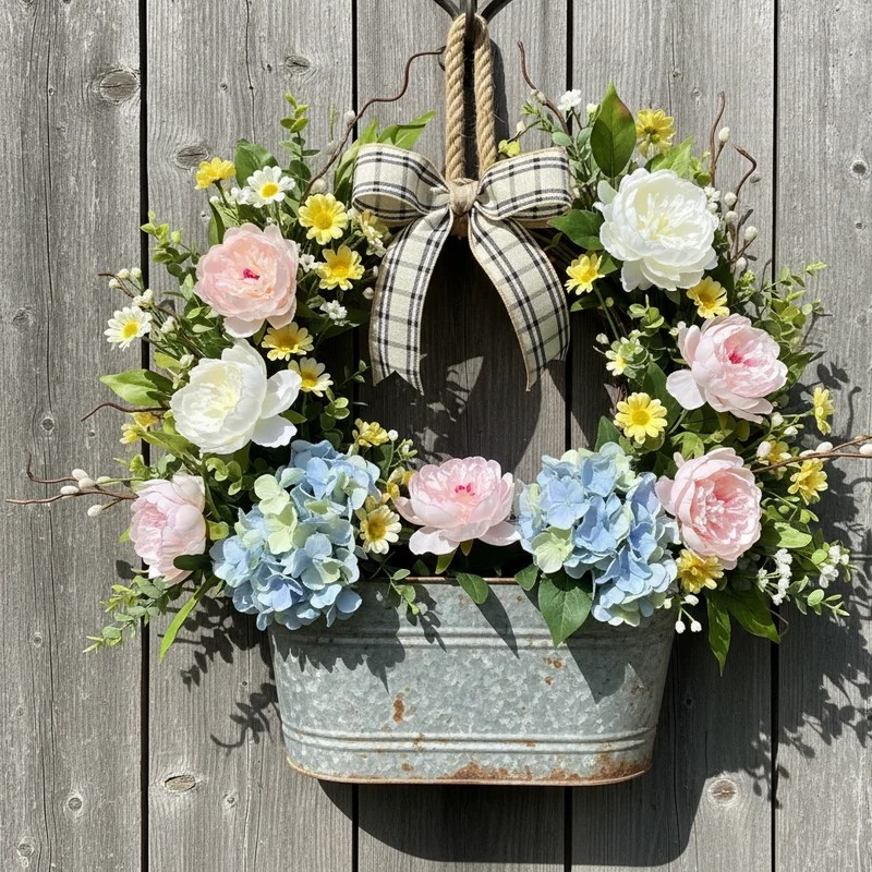 Channel that coveted farmhouse aesthetic with this unique wreath that incorporates a small galvanized bucket as both functional and decorative element. This design breaks away from traditional round wreaths while maintaining all the seasonal appeal. Mount a small galvanized metal bucket or vintage-style container to a wooden or wire base, then fill it with a gorgeous arrangement of spring flowers and greenery. Think tulips, daffodils, and fresh green stems spilling naturally from the container. Add farmhouse touches like burlap ribbons, twine details, or small wooden signs with spring messages. This three-dimensional approach creates incredible visual interest and works perfectly with rustic, farmhouse, or cottage-style homes. The bucket can be easily refreshed throughout the season by simply changing out the floral arrangement, making this a versatile long-term investment in your front door decor.