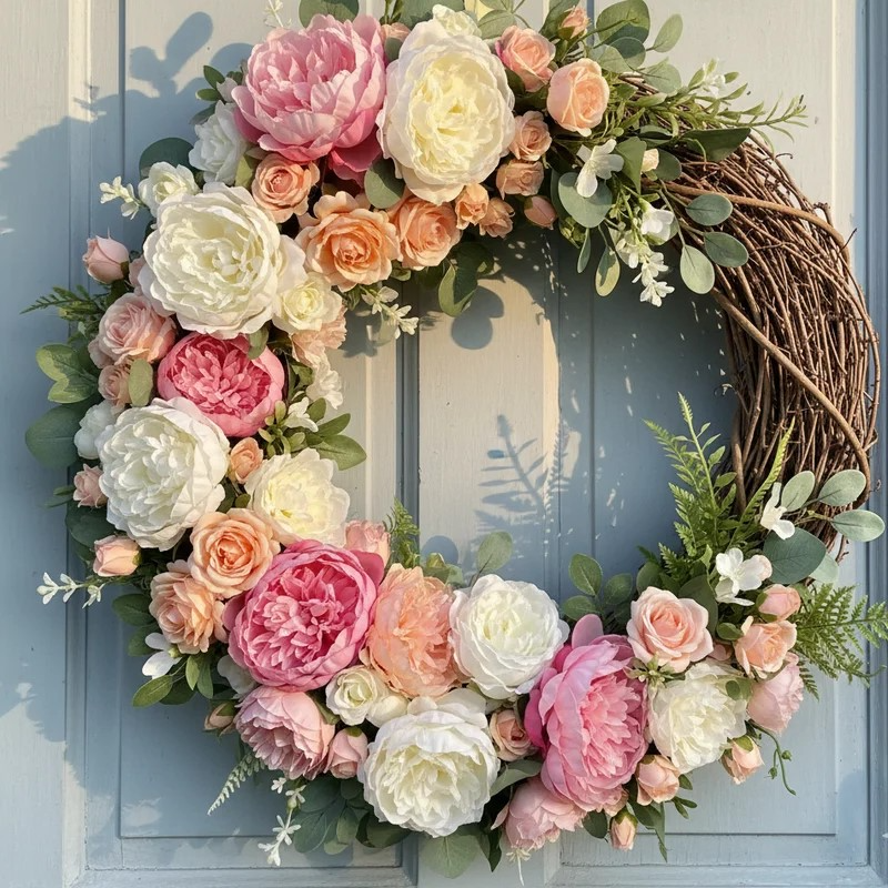 Indulge your romantic side with this luxurious wreath featuring the queens of the flower world – roses and peonies in soft, dreamy colors. This design embodies elegance and sophistication while celebrating spring's most beloved blooms. Choose roses and peonies in complementary shades like blush pink, cream, and soft yellow, mixing different sizes and bloom stages for natural variety. The key to this wreath's success lies in the quality of artificial flowers – invest in the best you can afford for realistic texture and color. Add touches of greenery like rose leaves and small filler flowers, but let the stars of this show remain the focal point. This wreath works beautifully on traditional homes, romantic cottages, or any entrance that appreciates classic feminine elegance. The soft color palette complements most door colors while creating an undeniably welcoming atmosphere.