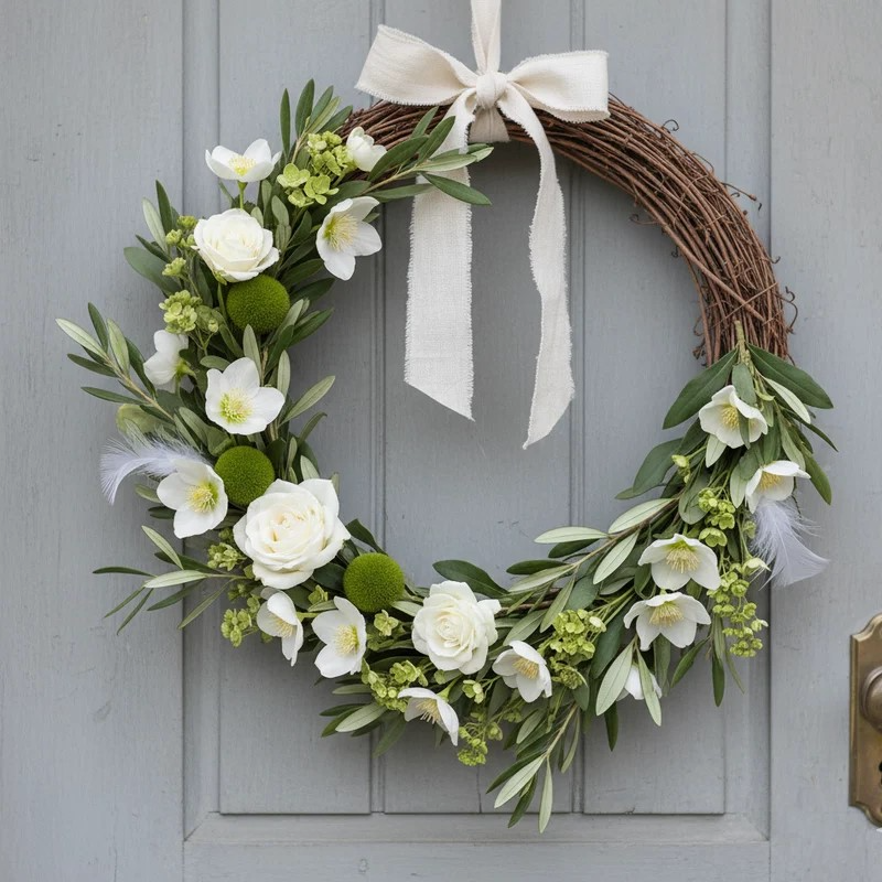 Sometimes the most sophisticated statement comes from simplicity, and this minimalist spring wreath proves that less truly can be more. Focus on a carefully curated selection of white flowers and varied green textures to create visual interest through form rather than color. Choose white roses, peonies, or ranunculus as your focal flowers, then add different types of greenery like eucalyptus, ferns, and olive branches. The varying shades and textures of green create depth while maintaining the serene, spa-like feeling. This design works exceptionally well on colorful front doors where the wreath won't compete for attention. The monochromatic palette feels fresh and modern while remaining timelessly elegant. Consider adding subtle texture through different flower types or incorporating small white berries for additional interest without breaking the color scheme.
