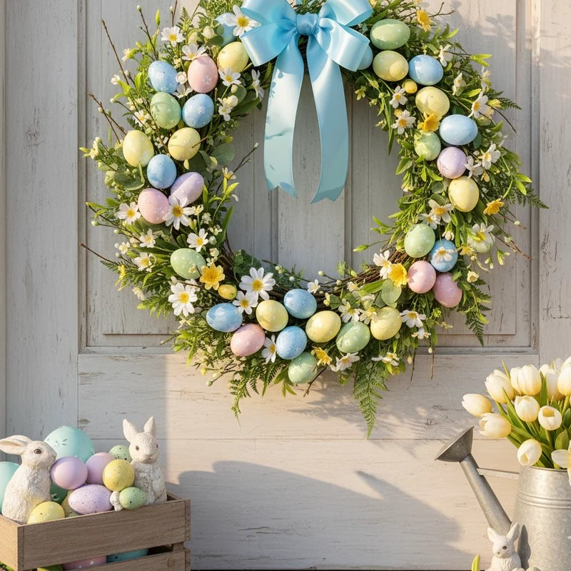 Transform your front door into an Easter wonderland with this playful wreath that brings childlike joy to your seasonal decor. This design combines pastel-colored eggs with fresh spring flowers and greenery for a celebration that's both festive and sophisticated. Use a foam or grapevine base and attach plastic or wooden eggs in various sizes using hot glue or wire. Choose soft blues, pinks, yellows, and lavenders for that classic Easter palette. Intersperse the eggs with silk flowers like hyacinths, crocuses, or small daffodils. Add some trailing greenery or pussy willow branches for movement and texture. This wreath brings immediate smiles and works especially well for families with children. The key is balancing the playful elements with sophisticated color choices and quality materials that elevate the overall design.