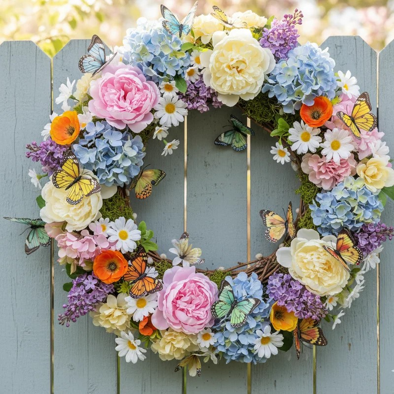 Bring the magic of a spring garden to life with this whimsical wreath that combines beautiful blooms with delicate butterflies in flight. This design captures the joy and movement of spring's awakening, creating a display that feels alive and dynamic. Start with a base of mixed spring flowers in coordinating colors – perhaps soft pinks, purples, and yellows. Then, add high-quality artificial butterflies positioned as if they've just landed or are about to take flight. Vary the sizes and colors of butterflies while keeping them within your overall color palette. The secret is positioning them at different angles and heights to create natural movement. This wreath particularly appeals to nature lovers and works wonderfully on homes with gardens or natural settings. Children absolutely love the butterfly details, making this perfect for family homes.
