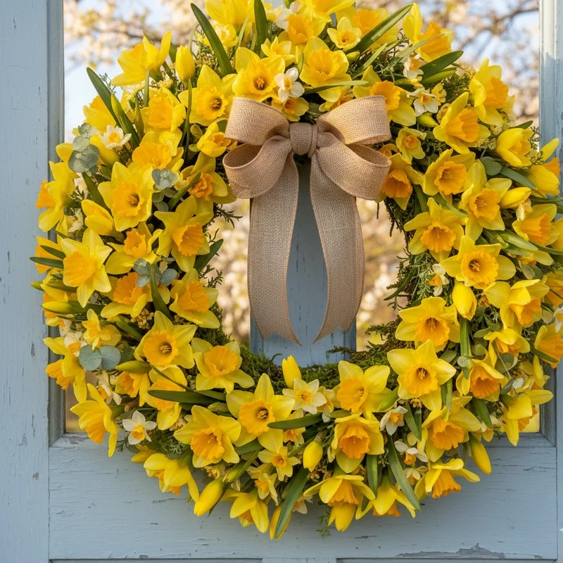 Brighten up those last gray days of winter with this cheerful daffodil wreath that radiates pure sunshine and optimism. Daffodils represent renewal and new beginnings, making them perfect symbols for spring's arrival. Use a combination of different daffodil varieties – some with traditional yellow centers and white petals, others in pure yellow or even white varieties. Arrange them densely around a foam or wire base, mixing in realistic green foliage and perhaps some early spring grasses. The bright yellow naturally draws the eye and creates an instant mood boost for anyone approaching your door. This wreath pairs beautifully with blue, white, or natural wood doors, but avoid red doors where the color combination might clash. Add a cheerful yellow bow or small decorative elements that enhance the sunny theme without overwhelming the natural beauty.