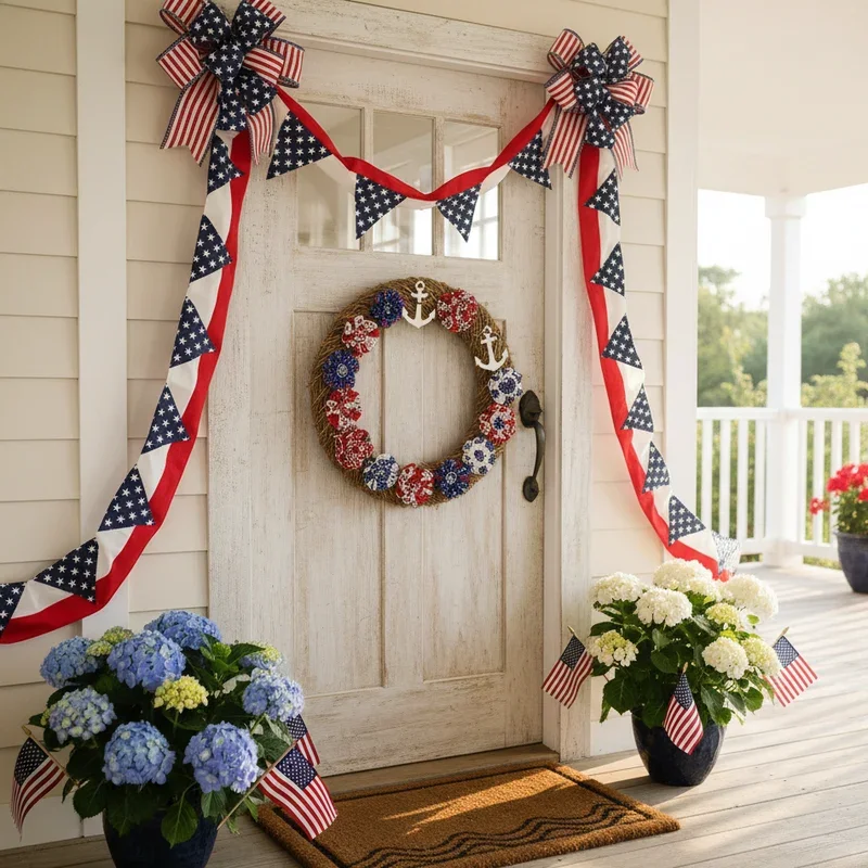 Combine summer fun with patriotic pride using red, white, and blue decorations perfect for season-long display. Create star-shaped wreaths using painted wooden stars or fabric-covered forms in patriotic colors. Add miniature American flags, ribbon streamers, and sparkly firework-inspired decorations throughout your design. Include vintage-style bunting or banner elements spelling "USA" or "FREEDOM" integrated into your door display. Mix different textures like burlap, denim, and gingham for rustic Americana appeal that feels authentically celebratory. Position battery-operated lights or reflective elements that catch sunlight for daytime sparkle. This versatile design works from Memorial Day through Labor Day, making it practical for extended summer decorating while showing national pride.