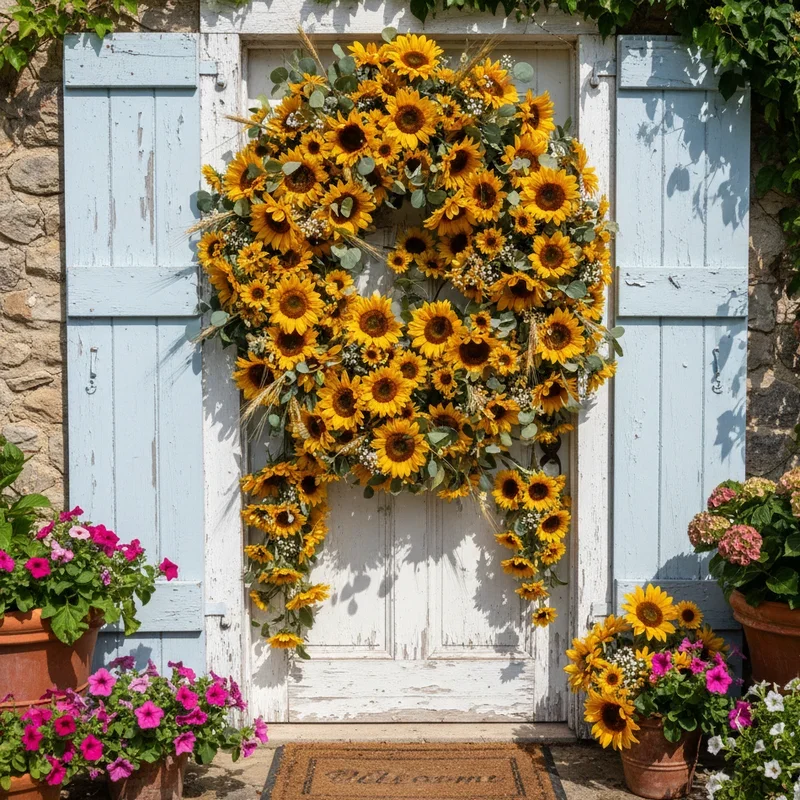 Transform your door into a field of sunshine with a bold sunflower wreath that radiates summer joy. Choose large silk sunflowers in various sizes, mixing bright yellow petals with smaller orange and burgundy varieties for depth and visual interest. Layer blooms densely on a grapevine base, allowing some flowers to extend beyond the traditional circle for wild, natural growth appearance. Add green leaves strategically between flowers, creating contrast that makes yellows pop even brighter. Include small bees or butterflies nestled among petals for whimsical touches that bring your wreath to life. Position your sunflower wreath where morning light hits it, creating shadows that dance throughout the day. This cheerful design works on any door color but looks especially stunning against blue or white backgrounds, creating that perfect summer contrast everyone loves.