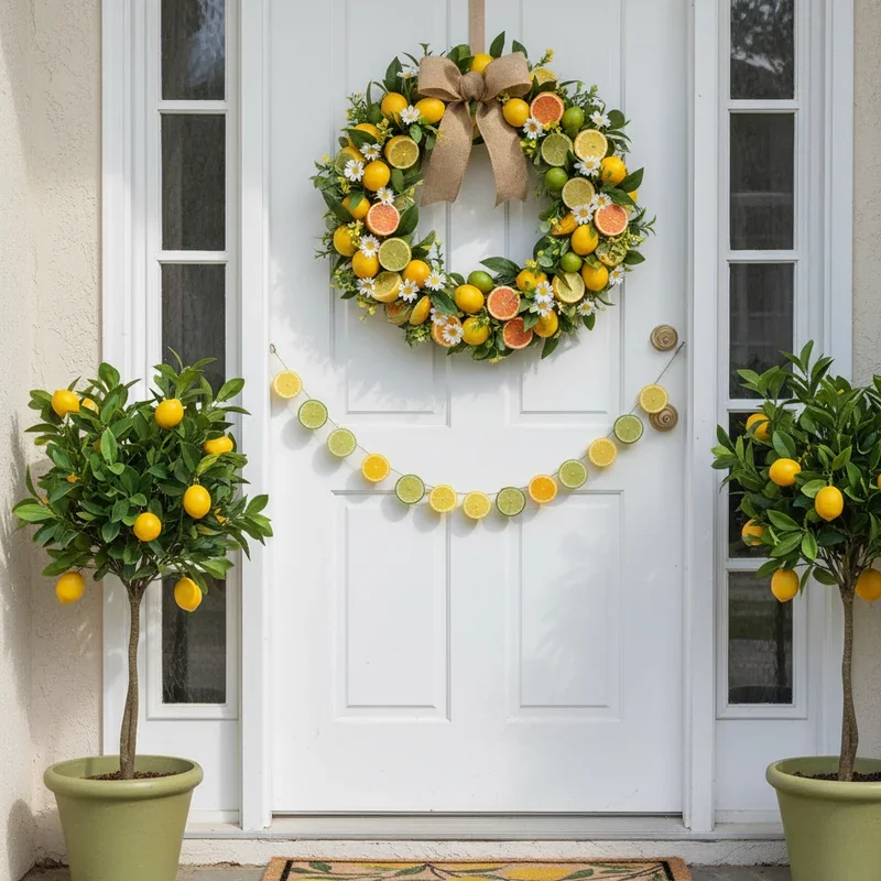 Brighten your entrance with a zesty citrus wreath that looks fresh-squeezed from summer itself. Arrange artificial lemons, limes, and oranges on your wreath base, mixing whole fruits with sliced versions showing juicy centers. Add white flowers like gardenias or magnolias between citrus for elegant contrast against vibrant fruits. Include glossy green leaves and small branches with blossoms suggesting fruit trees in bloom. Incorporate yellow gingham or white linen ribbon for farmhouse fresh appeal that complements citrus colors perfectly. Add subtle lemon-scented potpourri hidden within the wreath for aromatic welcome that engages multiple senses. This refreshing design brings Mediterranean or California grove vibes to any climate, making your door look like a fancy lemonade stand.