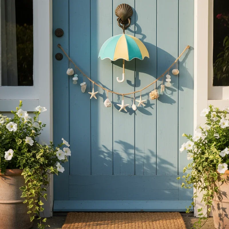 Turn a colorful beach umbrella into unexpected door art that brings poolside vibes to your entrance. Hang a small, decorative umbrella upside down, filling it with summer elements like artificial flowers, beach balls, or seaside treasures. Choose bright stripes or tropical patterns that complement your home's exterior color scheme. Add flowing ribbons or streamers from umbrella edges creating movement with every breeze. Include beach-themed ornaments like miniature surfboards, sand buckets, or cocktail decorations for playful details. Attach a "Life's a Beach" or "Sunny Days Ahead" sign for message clarity. This creative repurposing makes ordinary objects extraordinary while capturing summer's carefree spirit perfectly.