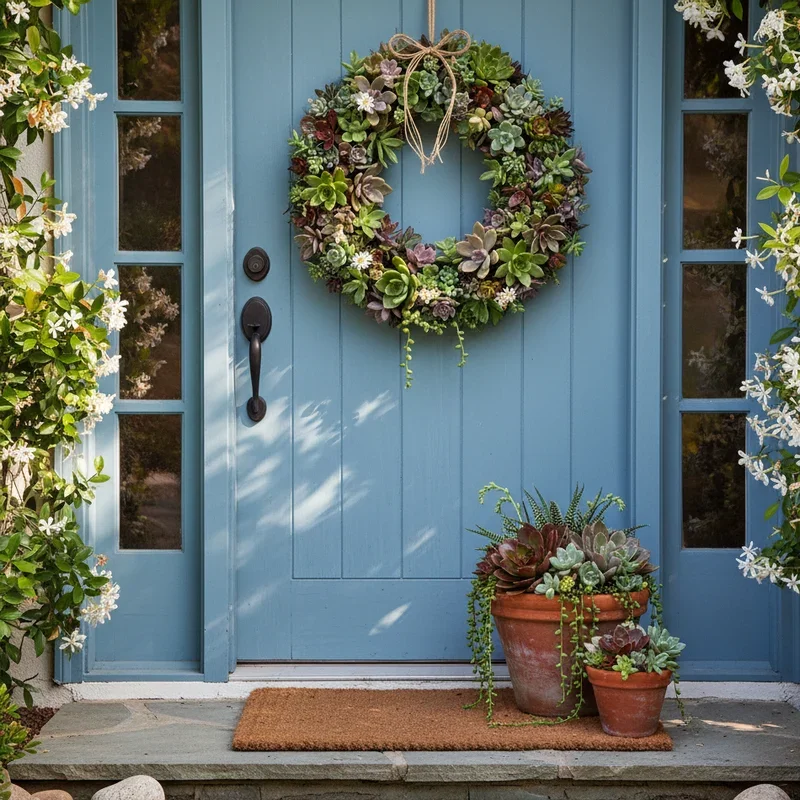 Design a living wreath using artificial or real succulents that brings desert beauty to your door. Arrange various succulent types in different sizes, colors, and textures for visual interest without overwhelming. Mix rosette shapes with trailing varieties, adding air plants for unexpected elements. Include small cacti carefully positioned for Southwest desert garden authenticity. Add decorative stones, moss, or sand between plants mimicking natural growing conditions. Choose drought-tolerant color schemes of sage greens, dusty blues, and subtle purples for sophisticated palette. This low-maintenance option appeals to modern minimalists while celebrating summer's hardy plants that thrive in heat.