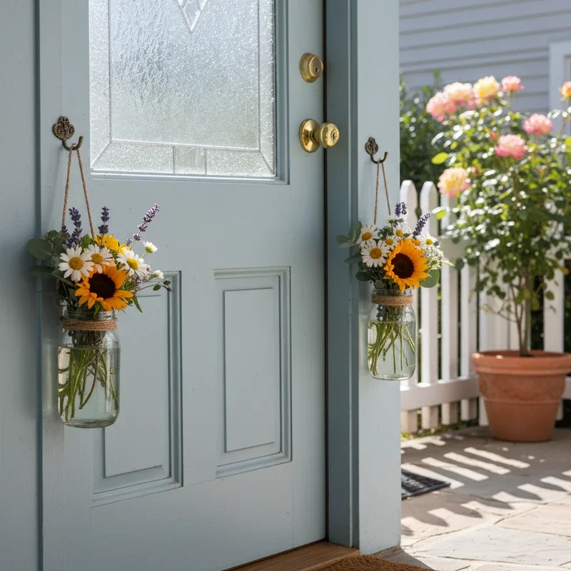 Create farmhouse summer charm using mason jars filled with wildflowers as door decoration. Hang multiple jars at varying heights using rope, wire, or decorative hangers from a wooden board. Fill jars with water and fresh flowers like sunflowers, zinnias, or daisies, changing weekly for continuous freshness. Add battery-operated fairy lights in some jars for magical evening glow effects. Include painted or decorated jars spelling "SUMMER" or displaying patriotic themes for seasonal messaging. Tie gingham or burlap ribbons around jar mouths for additional country charm. This versatile design allows easy flower changes throughout summer while maintaining consistent rustic framework.
