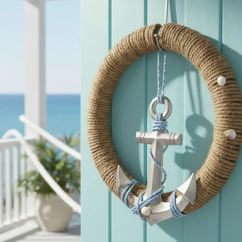 Channel maritime charm with a nautical-themed door decoration that brings oceanside vibes to any location. Wrap thick marine rope around a foam wreath form, securing with hot glue while maintaining rope's natural texture. Attach a decorative anchor at the bottom center, choosing weathered metal or painted wood for authentic seafaring appeal. Add navy blue and white striped ribbon bows, starfish, and small shells throughout the rope design. Include miniature sailboats, lighthouse figurines, or ship wheels for additional maritime storytelling elements. Paint your house numbers on small buoys or life preservers incorporated into the design. This coastal creation transports visitors to seaside harbors regardless of your actual proximity to water, making every arrival feel like a beach vacation beginning.