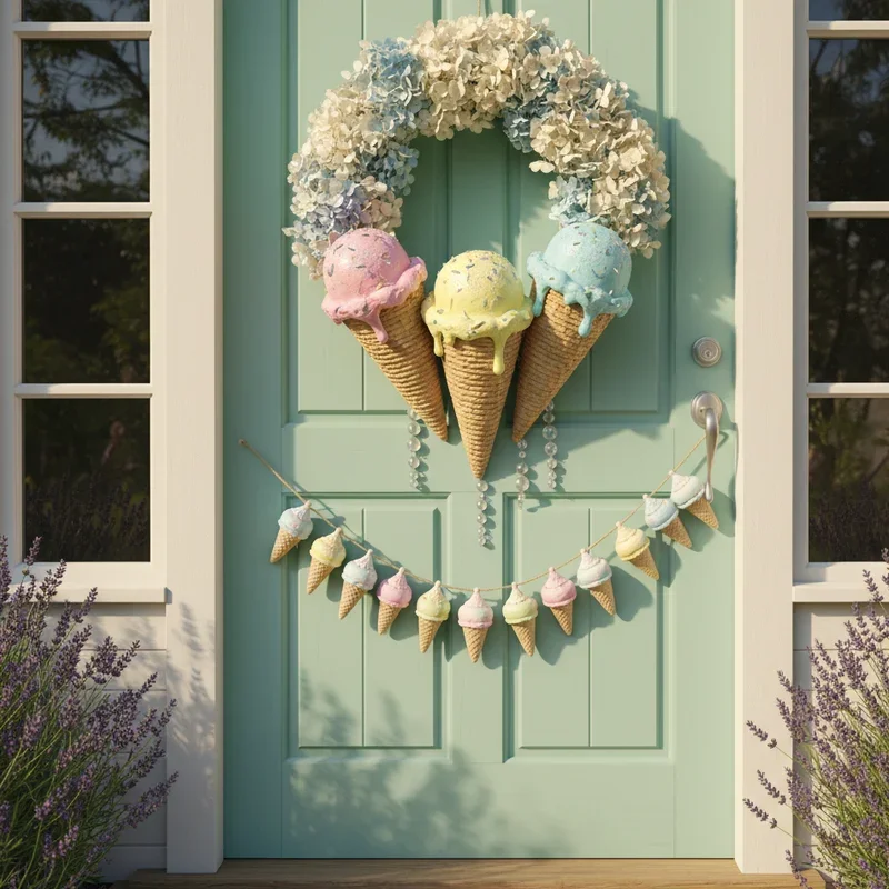 Sweeten your entrance with an ice cream-themed display that brings childhood summer memories flooding back. Create oversized ice cream cones using foam cones and colored pom-poms or fabric for scoops. Mix flavors like strawberry pink, mint green, and chocolate brown for variety that looks delicious. Add sprinkles using beads or sequins, creating texture that catches light playfully. Include vintage ice cream shop signs or menu boards for nostalgic diner atmosphere. Position multiple cones at different heights or create one statement piece that dominates door space. This whimsical approach guarantees smiles from visitors while celebrating summer's favorite frozen treat.