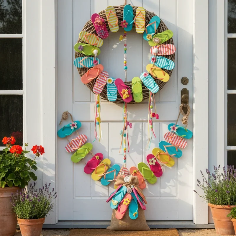 Celebrate summer's casual footwear with a playful flip-flop wreath that screams beach day fun. Arrange colorful flip-flops in circular patterns, using children's sizes for easier wreath construction. Mix patterns like stripes, florals, and solids in bright summer colors for maximum visual impact. Add small beach balls, sunglasses, or miniature beach towels between flip-flops for vacation theme reinforcement. Include sand dollars or shells glued to flip-flop straps for coastal connection without overwhelming the footwear focus. String battery-operated lights through the arrangement for evening parties or late arrivals. This lighthearted design particularly appeals to beach house owners or families who prioritize fun over formality in their summer decorating approach.