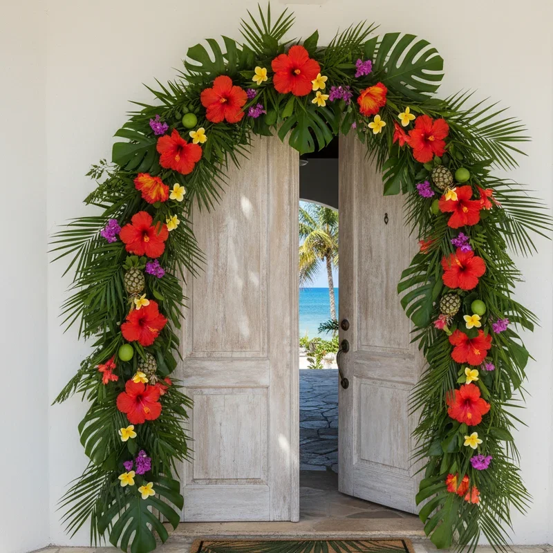 Create an island escape on your doorstep with vibrant hibiscus flowers that scream tropical vacation. Mix hot pink, coral, yellow, and orange hibiscus blooms with glossy green palm fronds for authentic Hawaiian atmosphere. Layer flowers at different angles, some facing forward while others show profiles for dimensional interest. Add plumeria, bird of paradise, or orchids among hibiscus for exotic variety that catches eyes from the street. Include small tiki decorations or miniature ukuleles for playful island touches without overwhelming floral beauty. Weave battery-operated string lights through your arrangement for evening glow that extends tropical magic past sunset. This bold design makes every guest feel like they're arriving at a beach resort rather than suburban home.