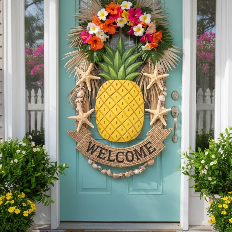 Embrace hospitality's universal symbol with a pineapple-themed door decoration that radiates warm welcome. Create or purchase a large pineapple-shaped sign, painting it in realistic colors or trendy metallics like gold. Surround your pineapple with tropical greenery, smaller pineapple accents, and complementary fruits for abundance messaging. Add "Welcome" or "Aloha" text in coordinating colors that enhance rather than compete with pineapple prominence. Include string lights outlining the pineapple shape for nighttime visibility and added tropical charm. Mix real and artificial elements like fresh palm fronds with silk flowers for dynamic natural touches. This classic symbol transcends trends while communicating your home's welcoming nature to all who approach.