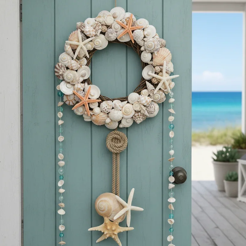 Transport beach treasures to your door with an ocean-inspired wreath covered in shells and starfish. Hot glue various sized shells onto a wrapped rope or twine base, creating patterns with conch, scallop, and sand dollar varieties. Position larger starfish as focal points while smaller ones fill spaces between shells naturally. Add dried sea grass, small pieces of driftwood, or fishing net for authentic beachcomber texture. Include pearls or glass beads that mimic water droplets for elegant coastal touches. Paint some shells in soft aqua or coral for color while maintaining natural tones predominantly. This seaside selection makes landlocked homes feel oceanfront, bringing vacation memories to daily life while creating conversations about beach adventures.