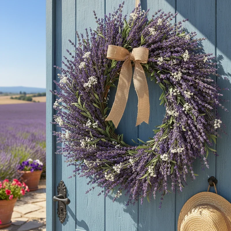 Bring Provence to your porch with a lavender wreath that combines visual beauty with calming fragrance. Bundle dried or artificial lavender stems, arranging them in spoke patterns radiating from wreath center. Mix purple varieties with white lavender for subtle color variation within your monochromatic theme. Add complementary herbs like rosemary or sage for aromatic complexity and textural interest among lavender sprigs. Include small bee decorations or vintage French market signs for authentic countryside touches. Tie with purple velvet or natural linen ribbon, allowing long tails to flutter in summer breezes. This sophisticated design appeals to those seeking elegance over bold colors while providing natural aromatherapy that welcomes guests with calming scents.