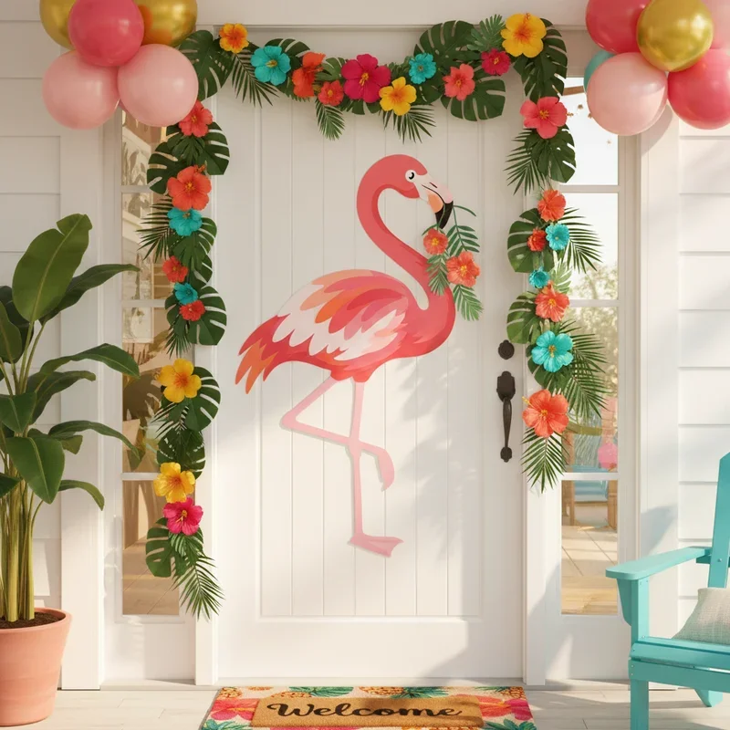 Pink flamingos have become summer's unofficial mascots, so embrace the trend with fabulous flamingo door decor. Arrange artificial flamingo figures or cutouts in group formations suggesting tropical pool parties. Mix different sizes and poses, some standing while others appear mid-stride for movement. Add palm fronds, tropical flowers, and perhaps tiny cocktail umbrellas for full resort atmosphere. Include metallic elements in gold or rose gold for glamorous flamingo party vibes. String pink lights or add pink tulle for extra feminine tropical touches. This trendy design captures Instagram-worthy style while maintaining summer's playful spirit throughout the season.
