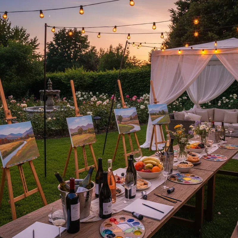 Combine creativity with relaxation hosting an outdoor painting party where wine flows and artistic expression flourishes. Set up individual easels with canvases, brushes, and acrylic paints in a shaded area protecting from direct sunlight. Hire a local artist to guide the group through a summer-themed painting or let creativity flow freely. Provide aprons or old shirts protecting clothes while maintaining a relaxed atmosphere. Offer wine pairings with each painting phase or create a tasting menu featuring summer wines. Include non-alcoholic options like fancy mocktails or infused waters for inclusive fun. Play background music that inspires without distracting from conversation and concentration. Display finished artwork gallery-style for admiration and photos before guests take home their masterpieces. This sophisticated activity creates lasting souvenirs while fostering connections through shared creative experiences.