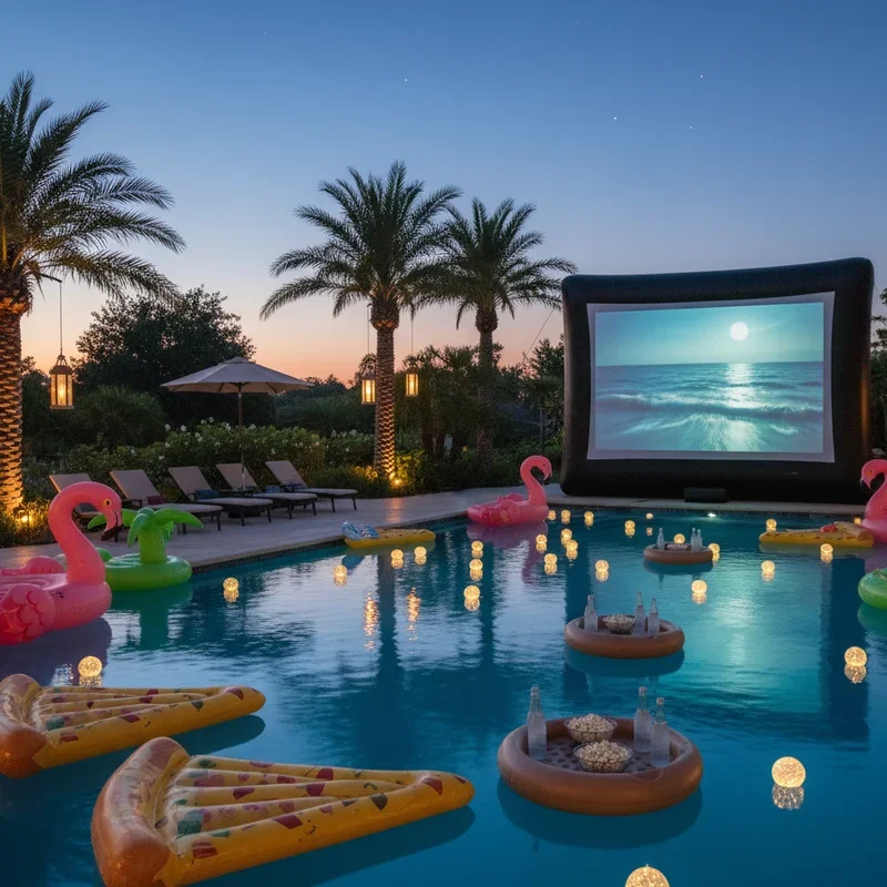 Elevate pool entertainment by combining swimming with cinema for an unforgettable aquatic movie experience. Position a projector screen where it's visible from the pool without getting splashed. Provide floating loungers, pool noodles, and inflatable furniture ensuring everyone stays comfortable during the show. Choose water-themed movies or summer classics that match the poolside setting perfectly. Serve floating snack boats with waterproof containers holding popcorn and treats. Install underwater LED lights creating ambiance without interfering with screen visibility. Include intermission pool games related to the movie for interactive breaks. Maintain appropriate water temperature with heaters if necessary for evening comfort. This unique combination offers the best of both summer pleasures, creating an experience guests will rave about.