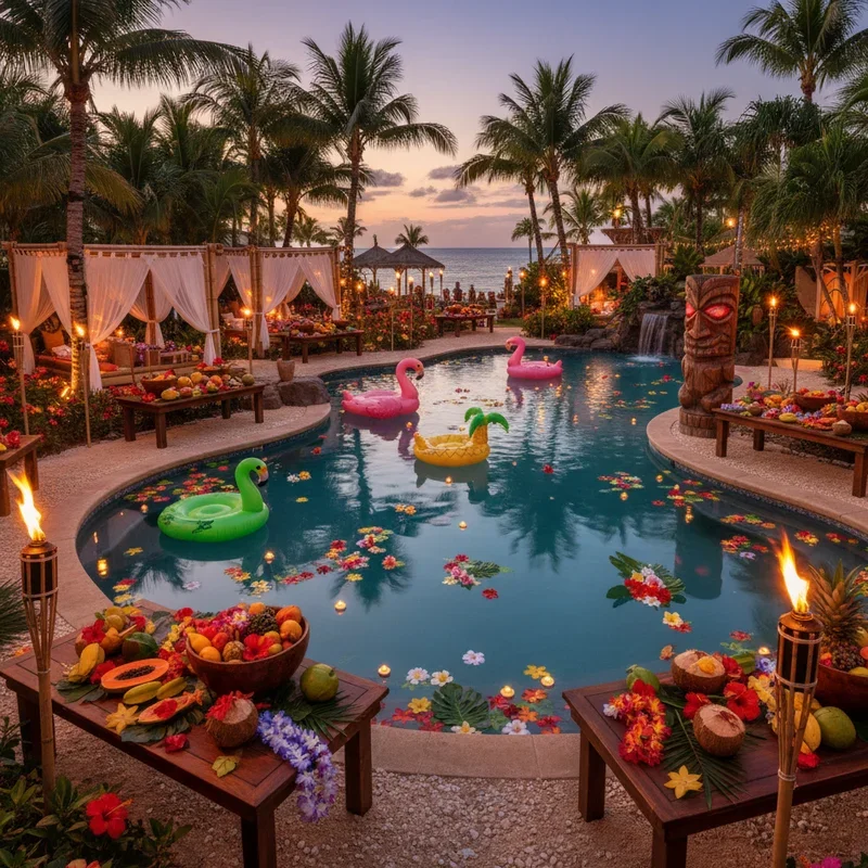 Transport your guests to a Hawaiian paradise without leaving your backyard with a full-blown luau celebration. Deck out your pool area with tiki torches, colorful leis, and inflatable palm trees that scream tropical vacation. Set up a DIY tiki bar serving mai tais, piña coladas, and fruit-infused water in hollowed pineapples for that authentic island vibe. Encourage guests to wear Hawaiian shirts and grass skirts while playing traditional luau games like limbo and hula competitions. Float hibiscus flowers in the pool and hang paper lanterns for magical ambiance as evening approaches. Serve traditional Hawaiian foods like kalua pork, poke bowls, and tropical fruit skewers that complement the theme perfectly. Play ukulele music and teach basic hula moves for interactive entertainment. This immersive theme creates vacation vibes that help everyone forget their daily stresses and embrace summer's carefree spirit.