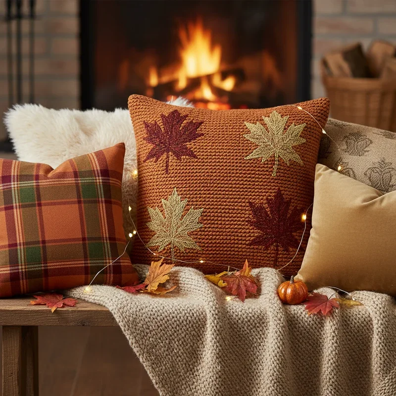 Layer sofas and chairs with autumn-themed throw pillows that invite lounging and create comfortable gathering spaces for pre and post-dinner relaxation. Mix solid colors in warm oranges, deep reds, and rich browns with pattern pillows featuring leaves, plaids, or Thanksgiving messages. Vary textures using velvet, cable knit, and linen pillows for tactile interest that makes spaces feel expensive and considered. Don't forget floor pillows for kids' table areas or additional seating when guest lists grow beyond furniture capacity. The soft additions make formal living rooms feel approachable and encourage guests to truly relax and enjoy. Pillow covers offer affordable way to transform spaces seasonally without replacing entire pillows, making seasonal decorating budget-friendly. Store summer pillows in winter pillow covers, maximizing storage efficiency.