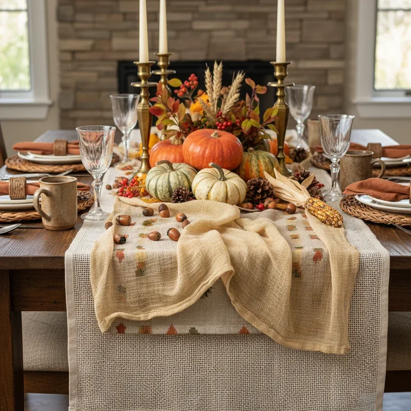 Forget the single table runner and embrace the layered look that adds depth and visual interest to your Thanksgiving table. Start with a neutral linen or burlap runner as your base, then add a narrower lace or macramé runner on top for texture. The contrasting materials create a rich, dimensional look that elevates simple table settings into something special. Scatter autumn leaves, acorns, or small pinecones along the runner's length for natural elements that tie into the season. This approach works particularly well on long tables where a single centerpiece might look lost. You can even create multiple focal points along the runner with small votive candles or miniature pumpkins. The beauty of layering is that you can mix high-end pieces with budget finds, creating an expensive look without the price tag.